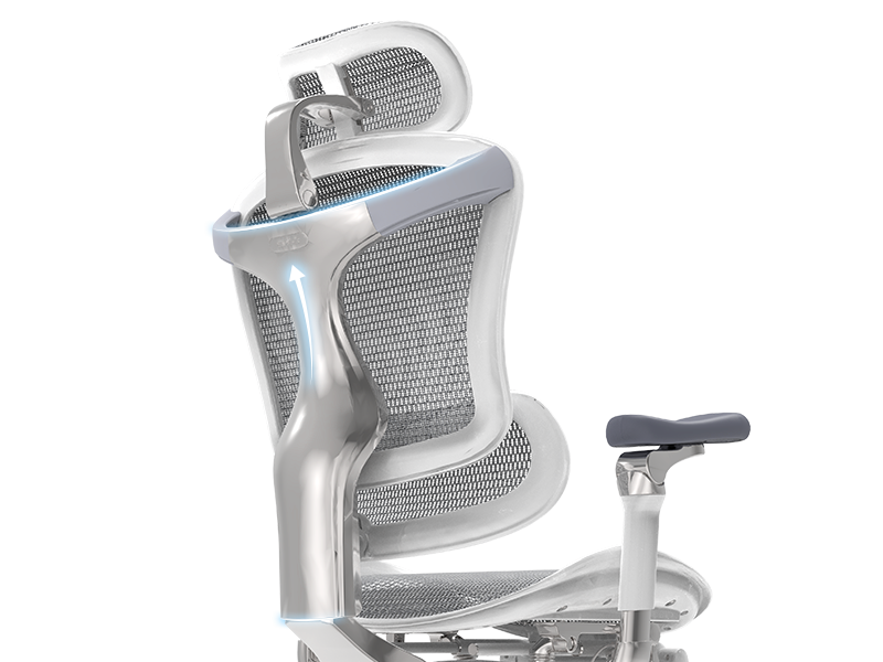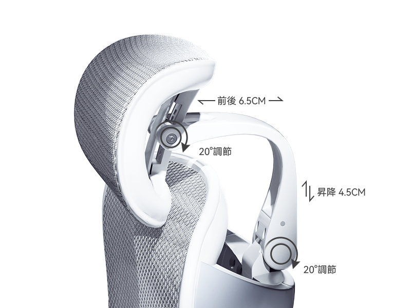 広角調整可能な3Dヘッドレストを採用し、昇降4.5cm、深さ25°、前後45°の調整ができます。肌に優しい柔らかいメッシュで快適に頭部を支えます。