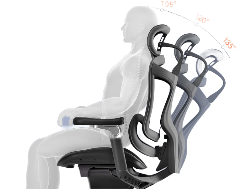 C500には、3段階のリクライニング機能があり、最大135度まで角度を調整可能です。作業途中にリラックスしたい時、少し仮眠を取りたい時など、なめらかに後傾姿勢から睡眠姿勢へ実現します。
