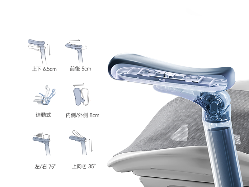 アームレストは昇降、前後、左右、内外、角度などの調整ができて、
