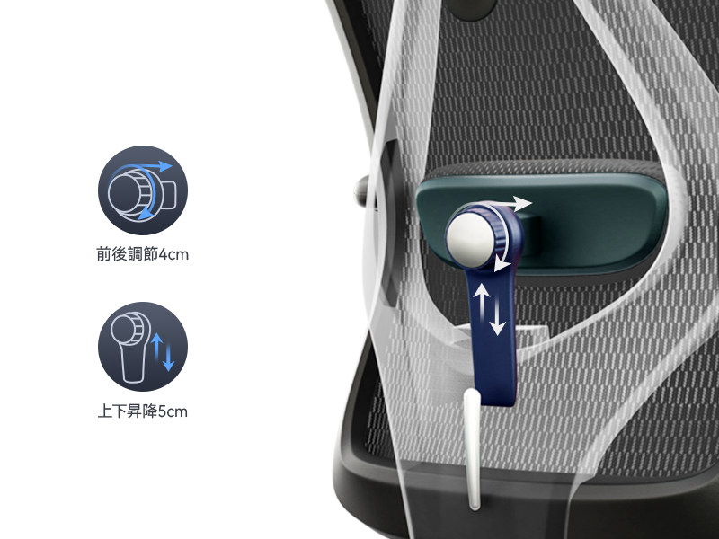 多方向調節可能のランバーサポート2Dランバーサポートご身長や体勢に合わせて、ランバーサポートは上下5cm、前後4cmが調節可能、腰を支えて長時間の座りにより腰の痛みを改善できます。