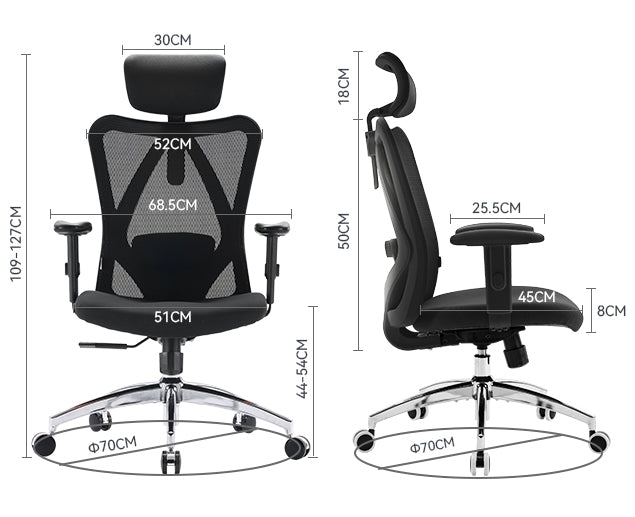 SIHOO M18 椅子の寸法は幅68.5、奥72、椅子の高さ109-130cmです。座面昇降は43-53cmで日本人の体格に合わせて座りやすい座面高こだわりました。