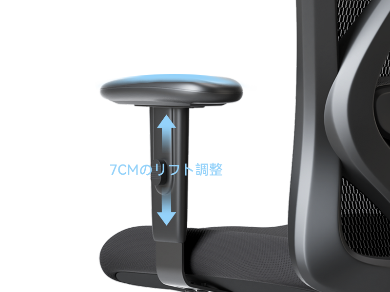 7cm上下昇降機能のアームレストを搭載し、体型やデスクの高さに合わせて調整し、肘を置いた状態でデスクワークをすることで、肩こりの予防にもお役に立てます。